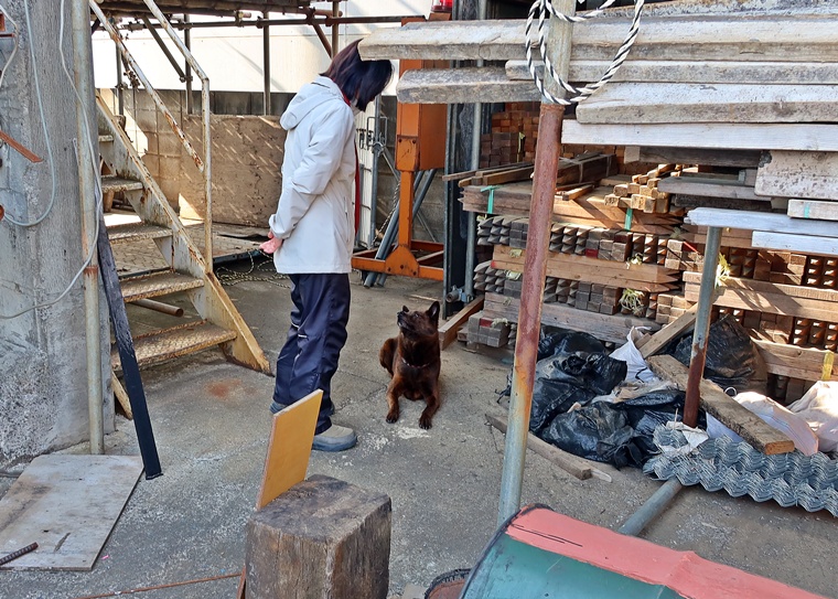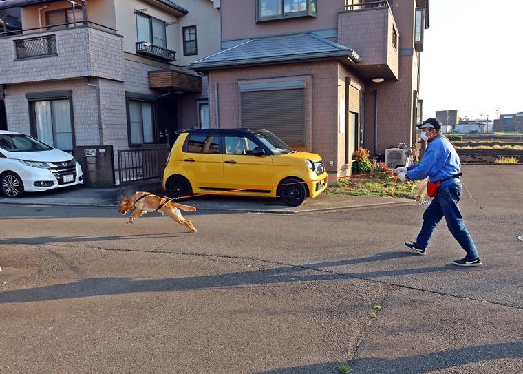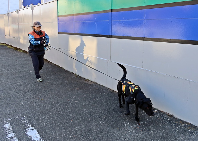 Trailingでは、基礎となるモチベーションランを含めた物品と臭跡の関連付けの確認に加え、先日の実働での結果を踏まえ、屈折やオープンスペースにおける臭跡への反応、ディストラクション環境下でのハンドリングなどを設定し訓練を行いました。